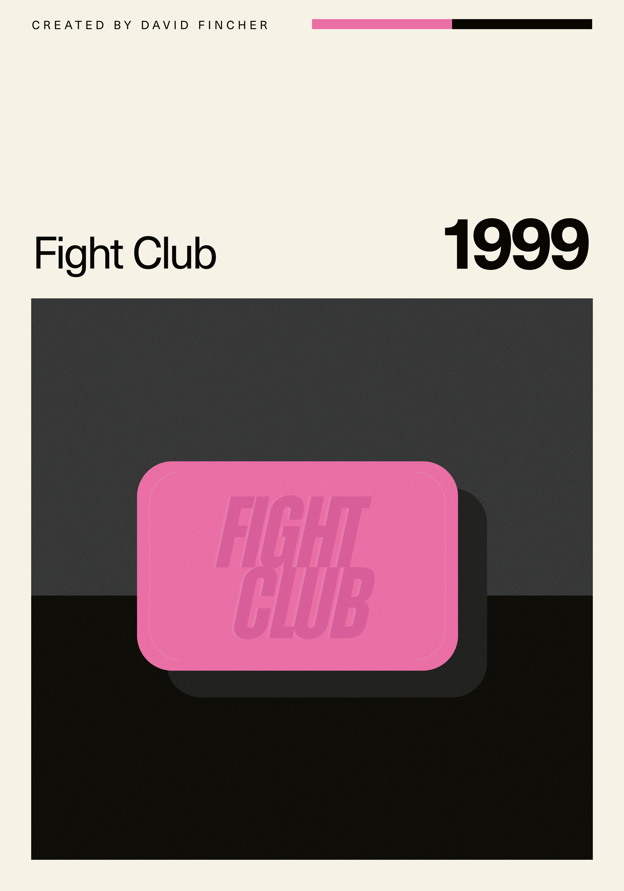 映画「ファイトクラブ」の象徴的なピンクの石鹸をモチーフにしたミニマルなポスター。ダークな背景に大きく描かれた石鹸と「FIGHT CLUB」の文字が印象的なデザインです。