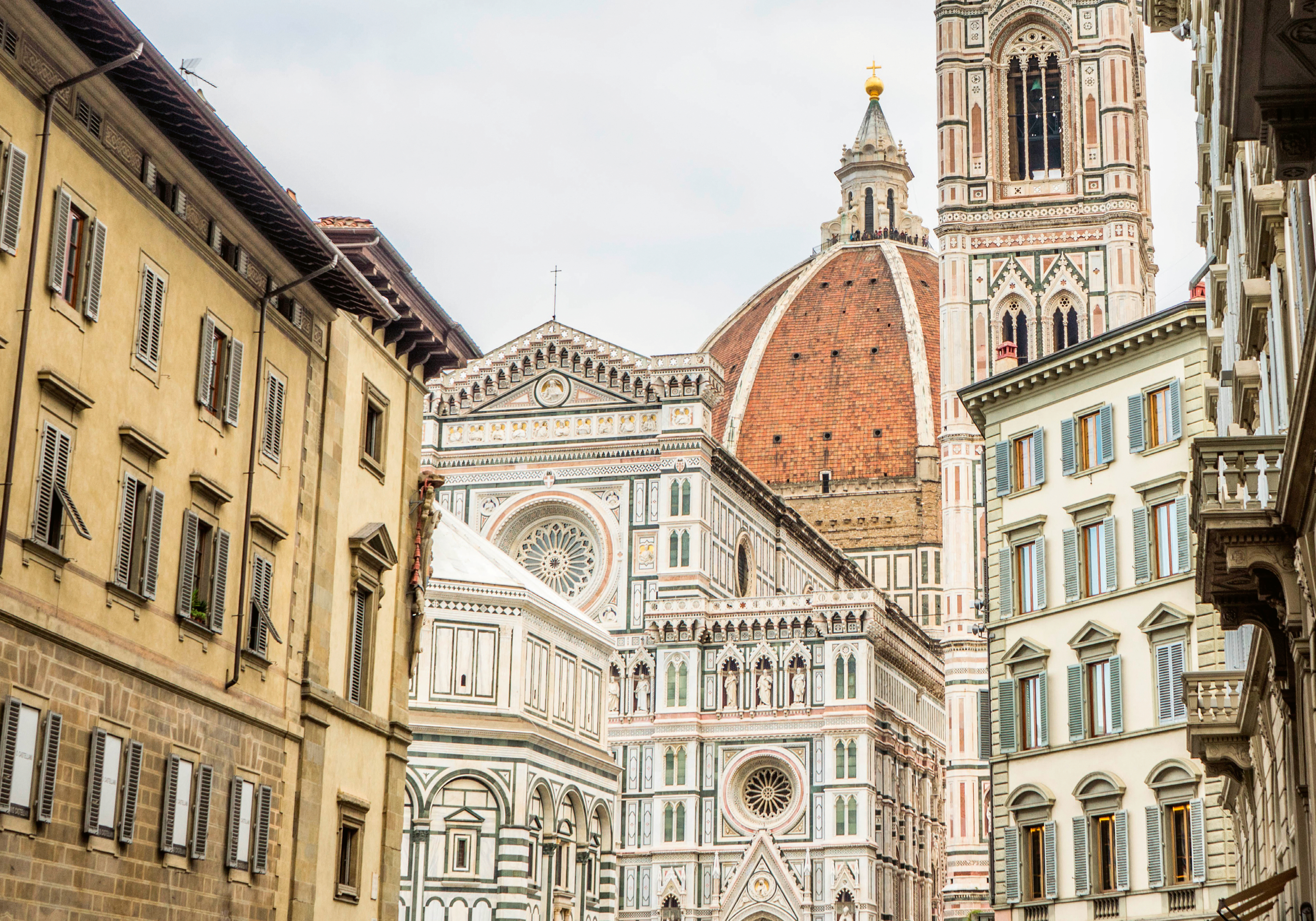 高い建物が並ぶ街に、赤いドームと美しい模様の大聖堂が目立ちます。イタリアの街並みを描いたポスターです。