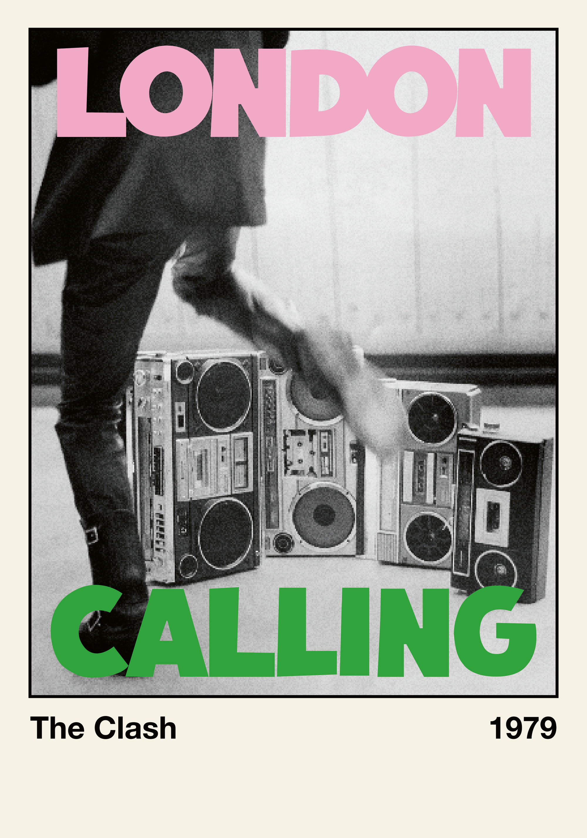 ピンクとグリーンの文字が目を引く、白黒写真のクールなポスター。音楽の力強さを感じるデザインです。