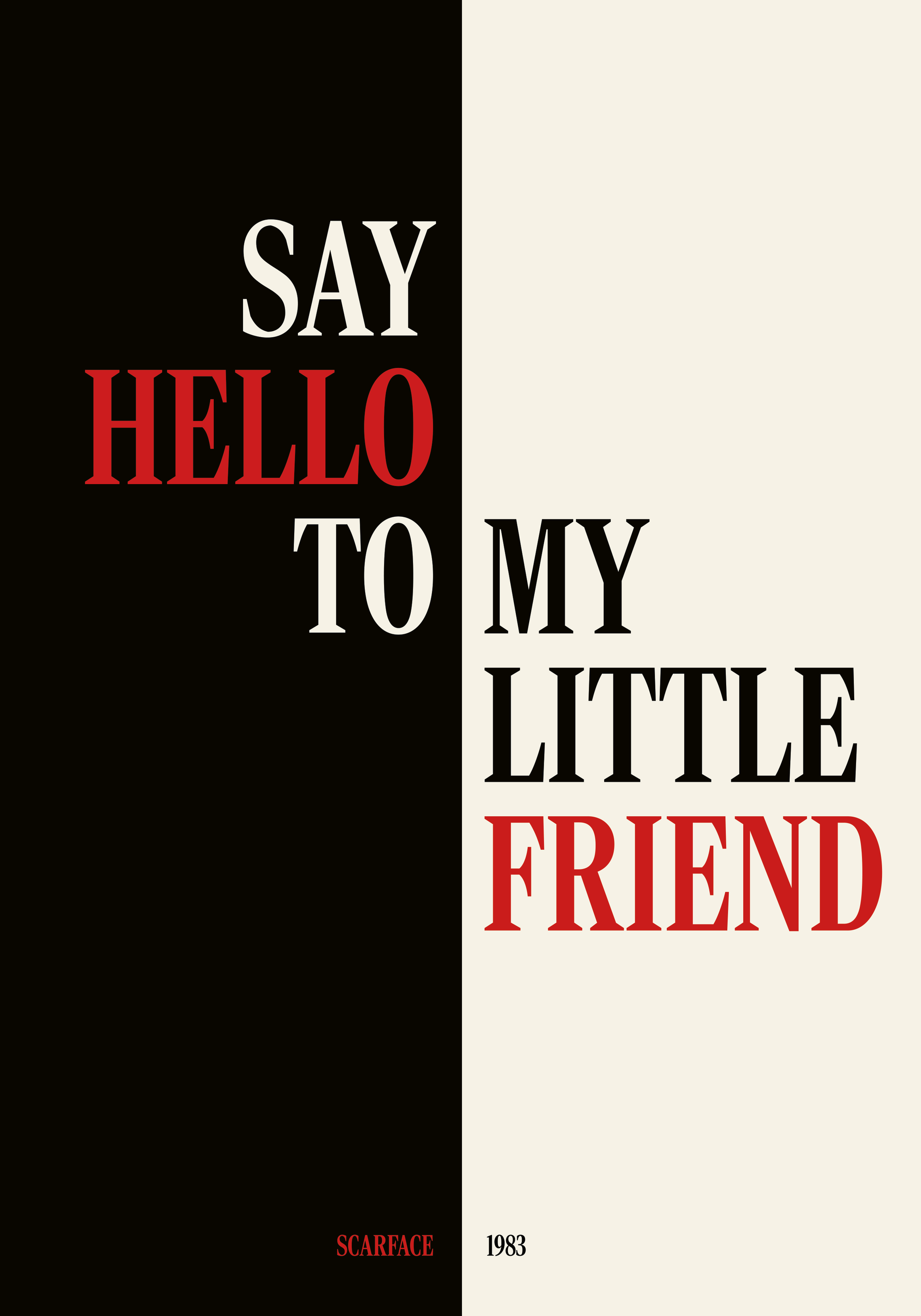 黒とベージュの背景に、赤と黒の大きな文字で「SAY HELLO TO MY LITTLE FRIEND」と書かれたポスター。映画「SCARFACE」1983年のデザインです。