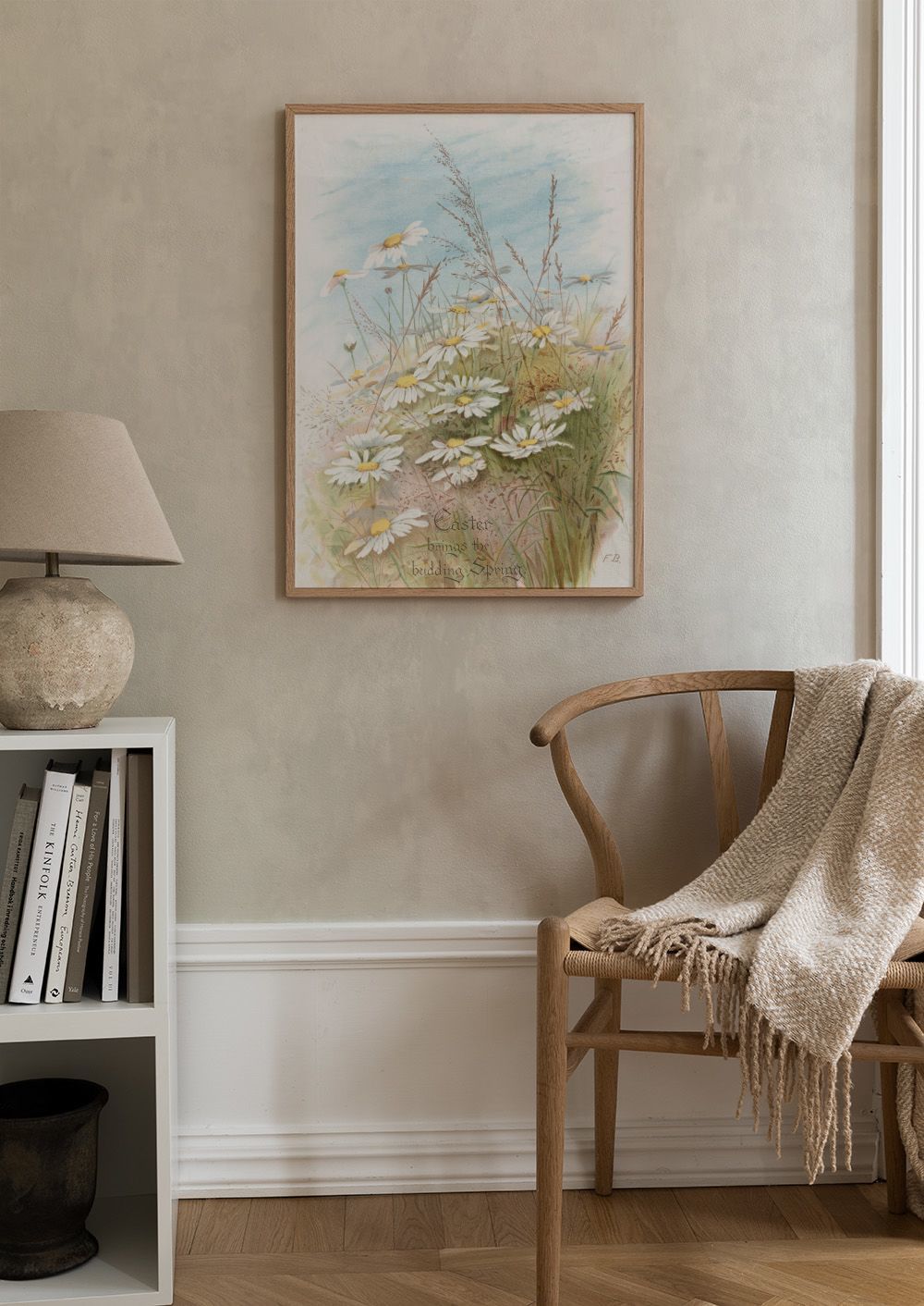 白いデイジーと緑の葉が優しく咲く、春の草原ポスター。淡いブルーの空と柔らかな色合いが、お部屋に穏やかな雰囲気を作ります。