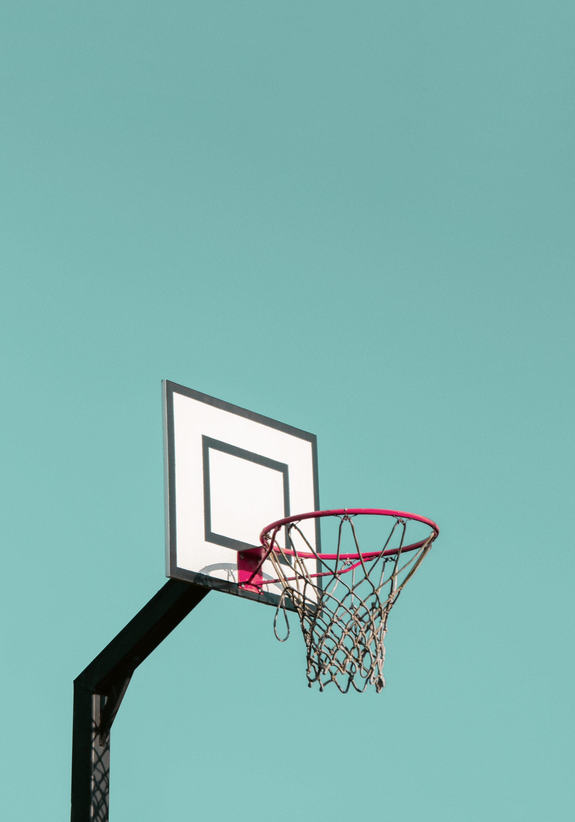 明るい青空を背景に、赤いリムとネットが付いたバスケットボールフープ。白黒のバックボードと黒いポールがすっきりとした印象を与えます。