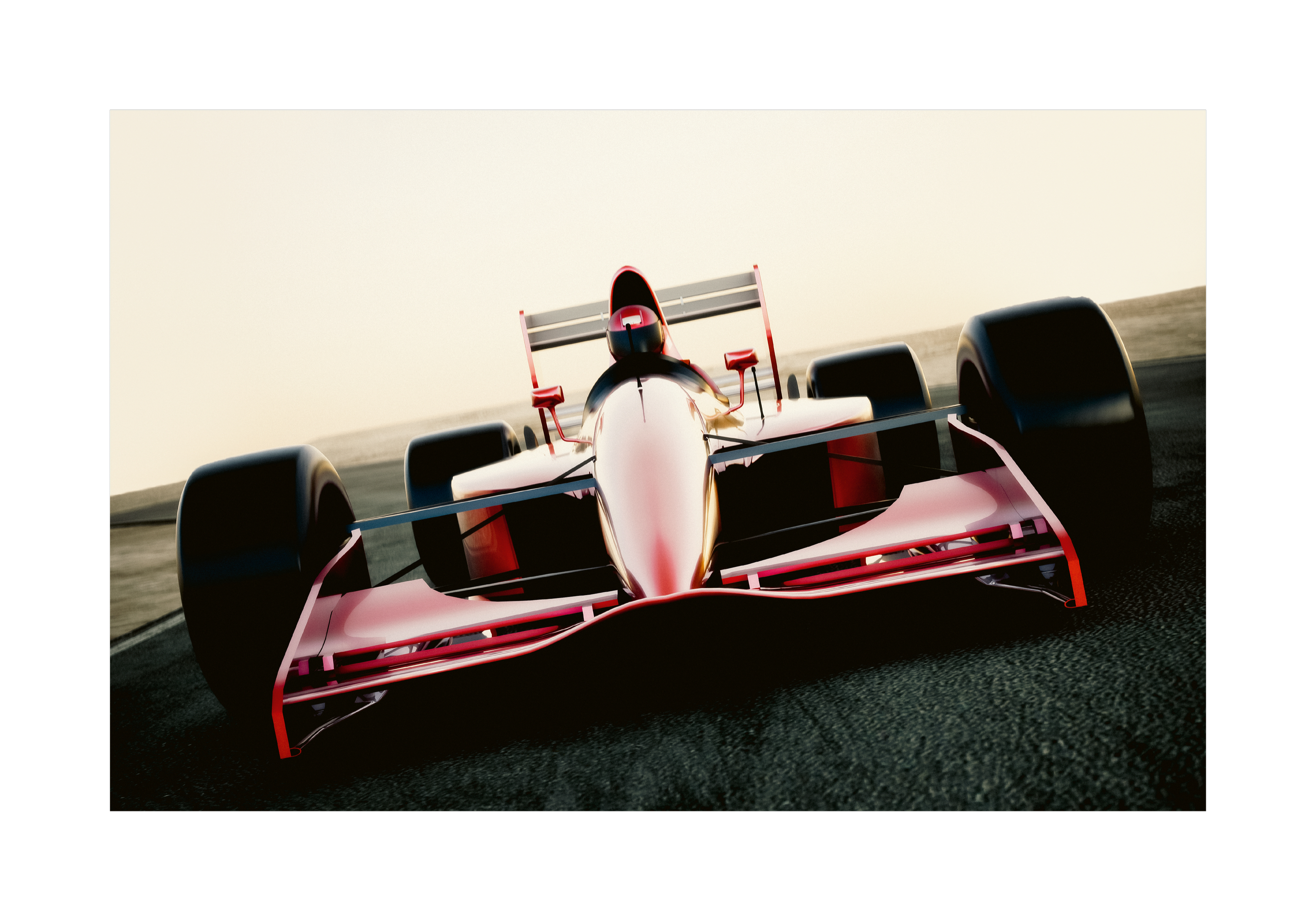 赤いレーシングカーが道路を走る様子を描いたポスター。流線型のボディと大きな黒いタイヤが特徴的で、スピード感あふれるデザインです。