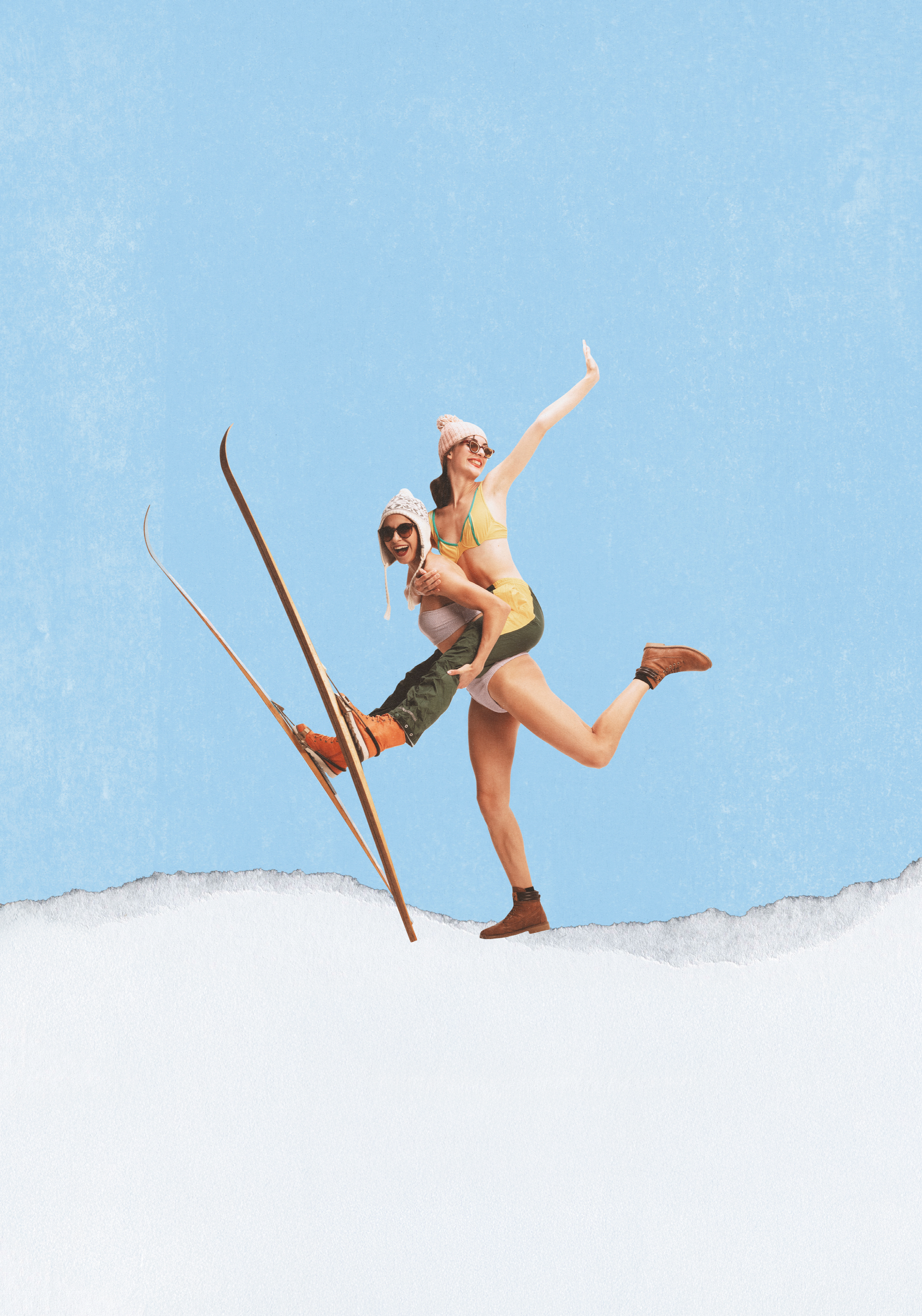 青空の下、スキーを履いた2人が楽しそうにポーズ。カラフルな服とサングラスで、雪の上での遊び心あふれる瞬間を捉えたヴィンテージ風ポスター。