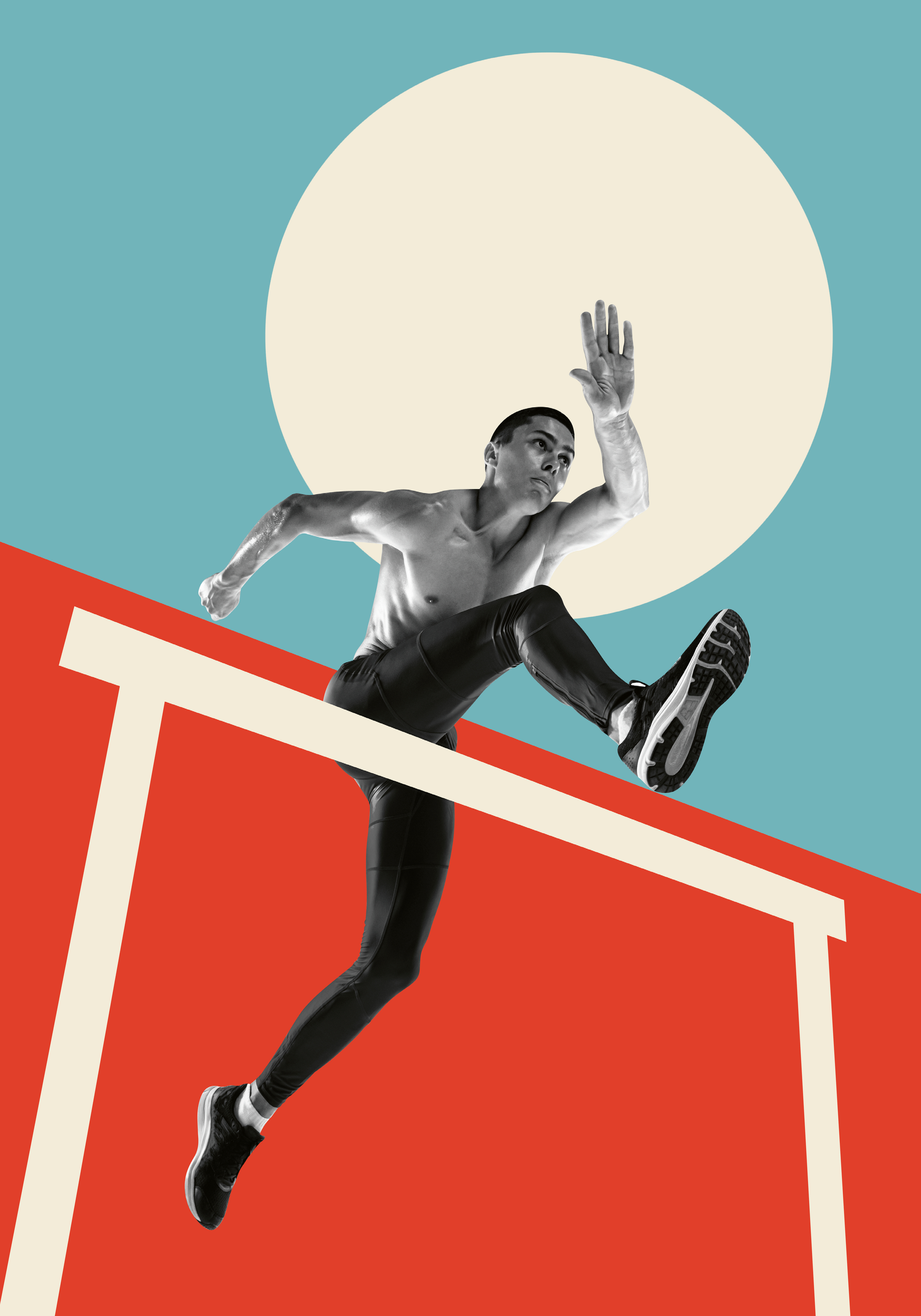 青い空と大きなクリーム色の円を背景に、赤いハードルを飛び越える男性アスリートのポスター。モノクロの身体とカラフルな背景が美しいコントラストを作ります。