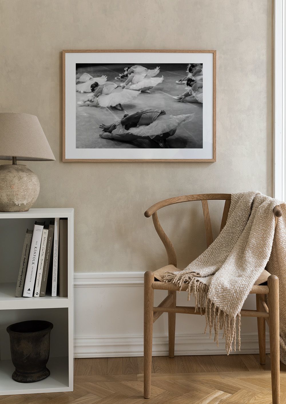 優雅なポーズで床に座るバレエダンサーたち。明るい色のチュチュを着て、髪は飾りのついたきれいなお団子にまとめています。白黒の写真が、クラシックで美しい雰囲気を作り出すポスターです。