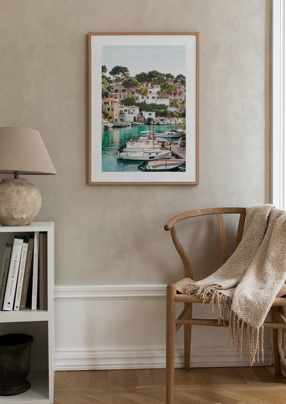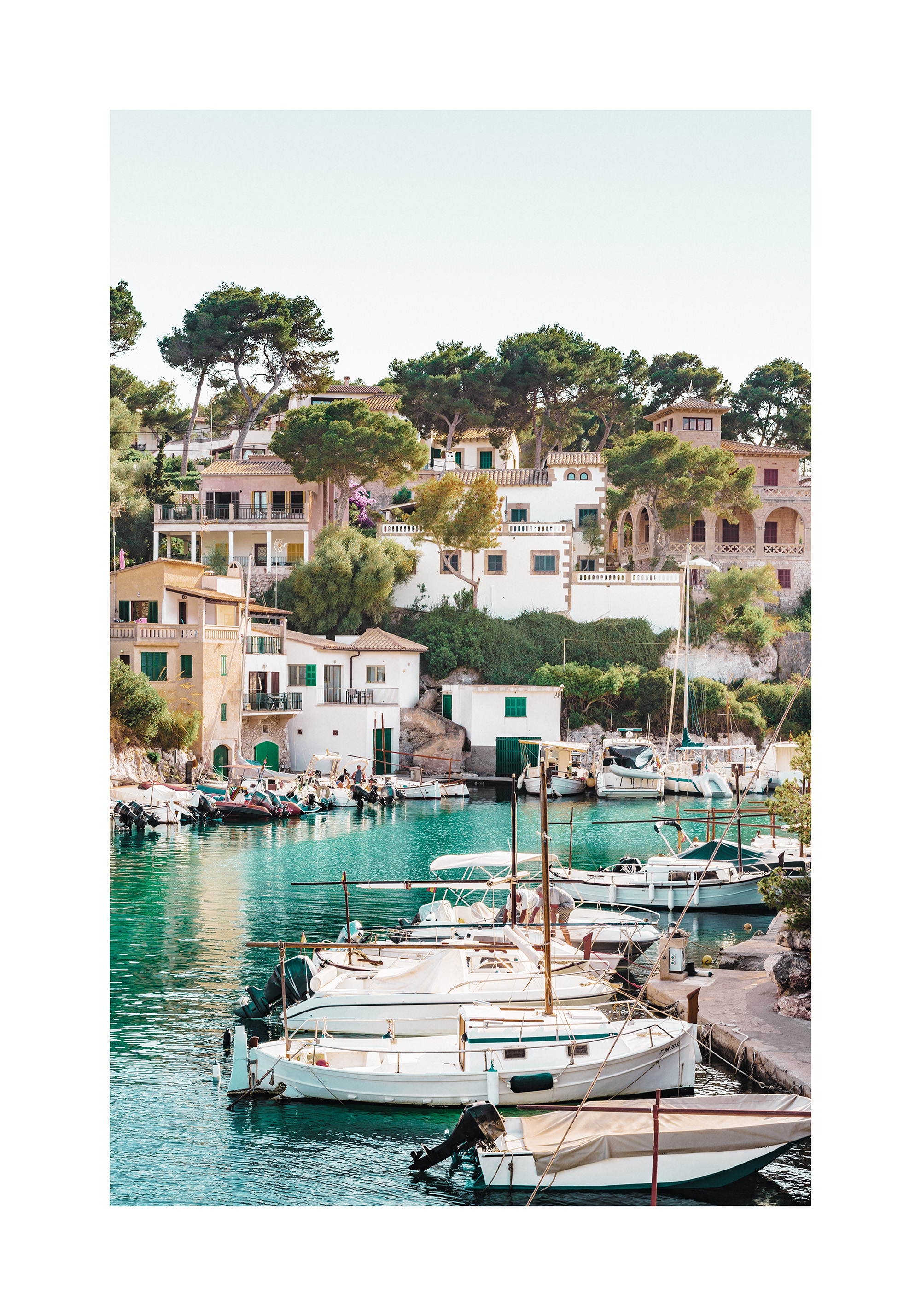 穏やかなターコイズブルーの海に浮かぶボートと、白い建物が並ぶ美しい港町の風景。明るく平和な雰囲気のポスターです。