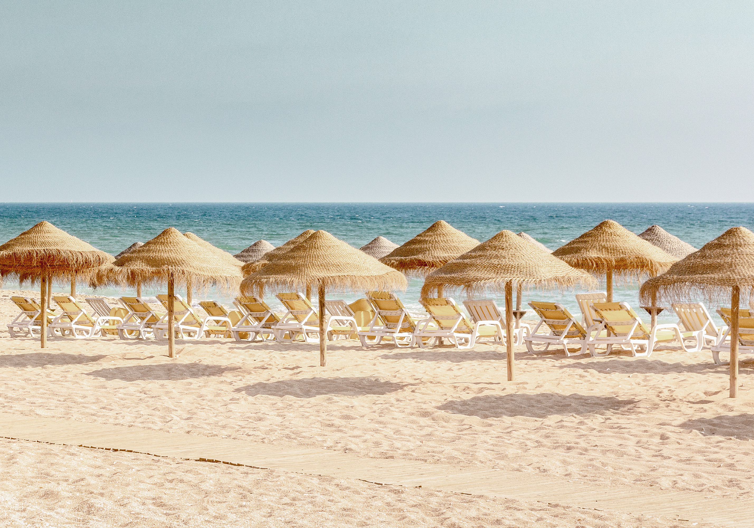 晴れた日のビーチに並ぶ麦わらパラソルのポスター。青い海と空が広がる穏やかな砂浜の風景です。
