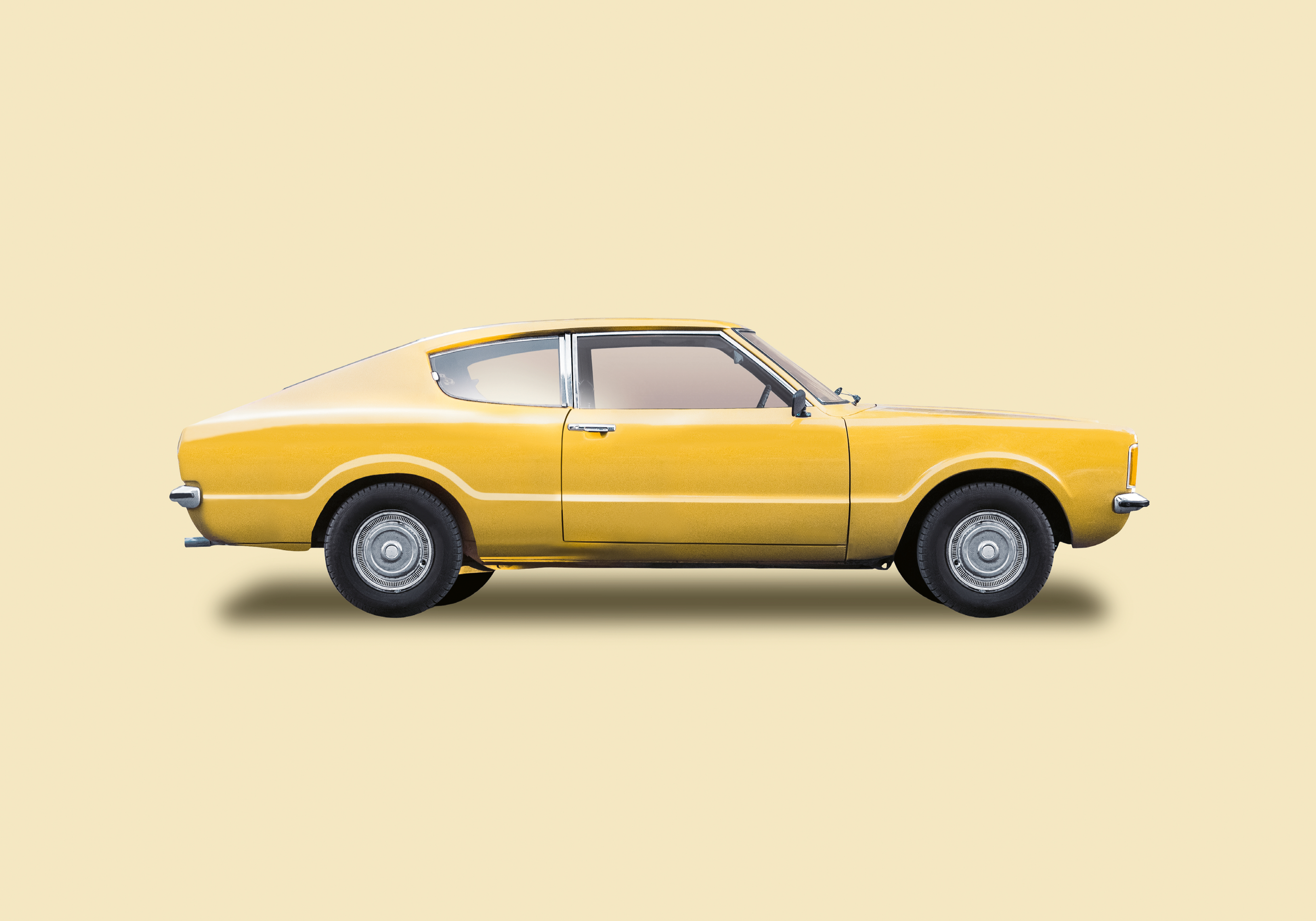 黄色いヴィンテージカーを横から見たポスター。なめらかな曲線と銀色に輝くホイールが特徴的です。ベージュの背景にやさしい影が落ち、奥行きのある一枚に仕上がっています。
