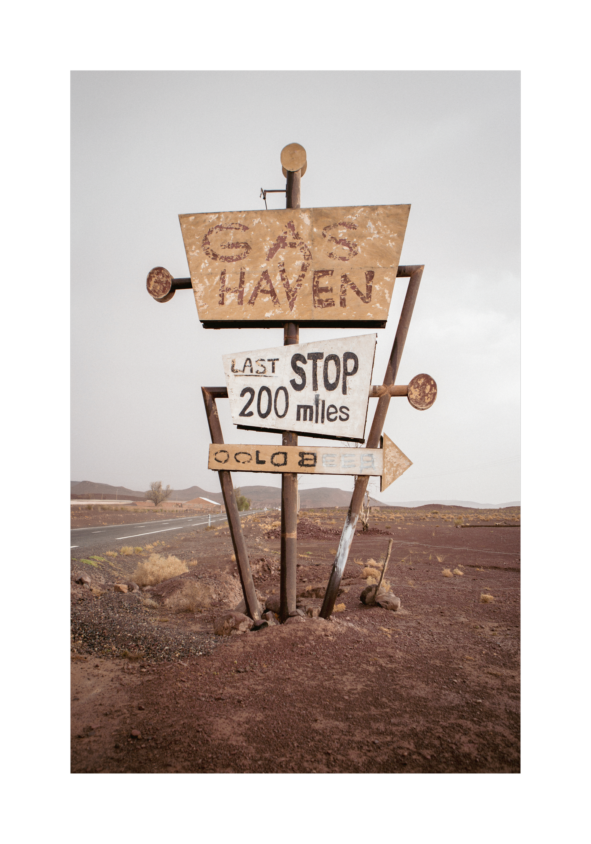砂漠の道路沿いに立つ古びた看板のポスター。「GAS HAVEN」「LAST STOP 200 miles」の文字が見えます。錆びた矢印が右を指し、赤茶色の岩場と灰色の空が広がるレトロな風景です。