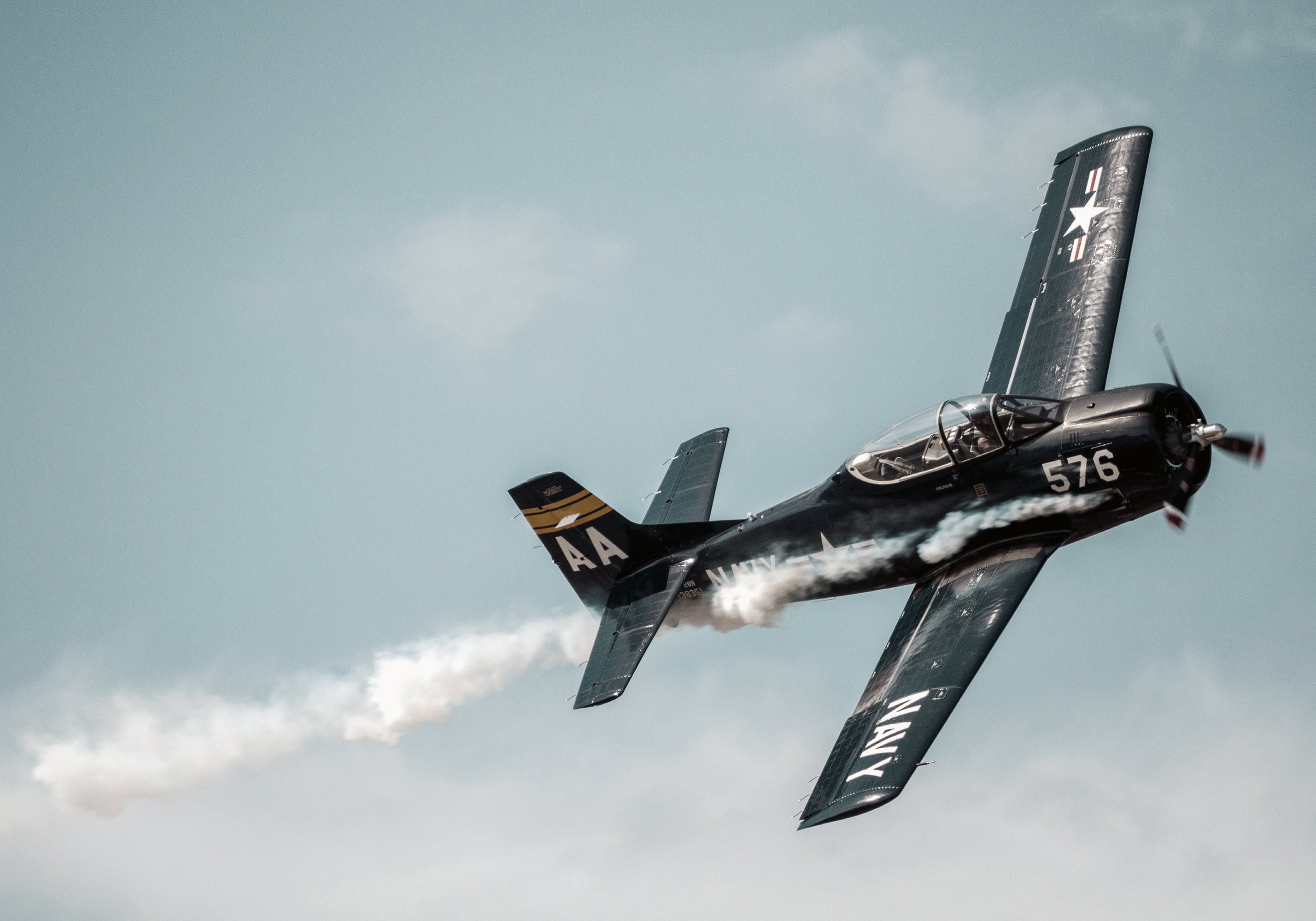 青い空を飛ぶネイビーの飛行機ポスター。白い煙が後ろに広がり、プロペラと星のマークが特徴的です。子供部屋にぴったりな航空機アートです。