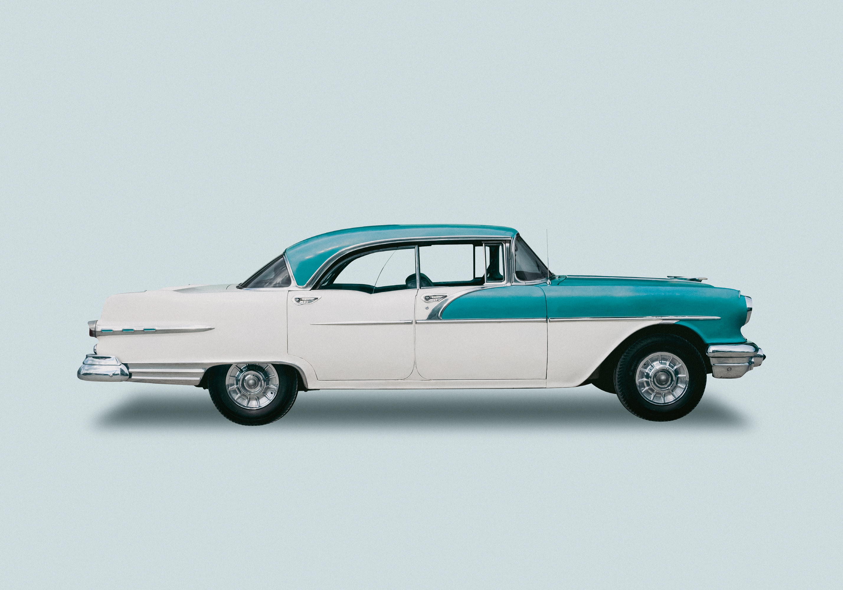 ターコイズと白のツートンカラーがレトロでおしゃれなクラシックカーのポスター。丸みのあるフォルムとクロームの輝きが魅力的です。