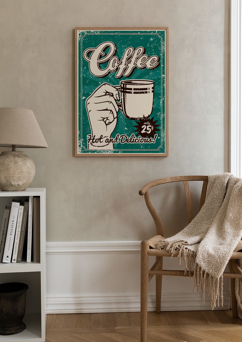 緑の背景に大きな文字で「Coffee」と書かれたレトロなポスター。手がコーヒーカップを持ち、「Hot and Delicious!」の文字が見えます。ヴィンテージ風のデザインが特徴です。