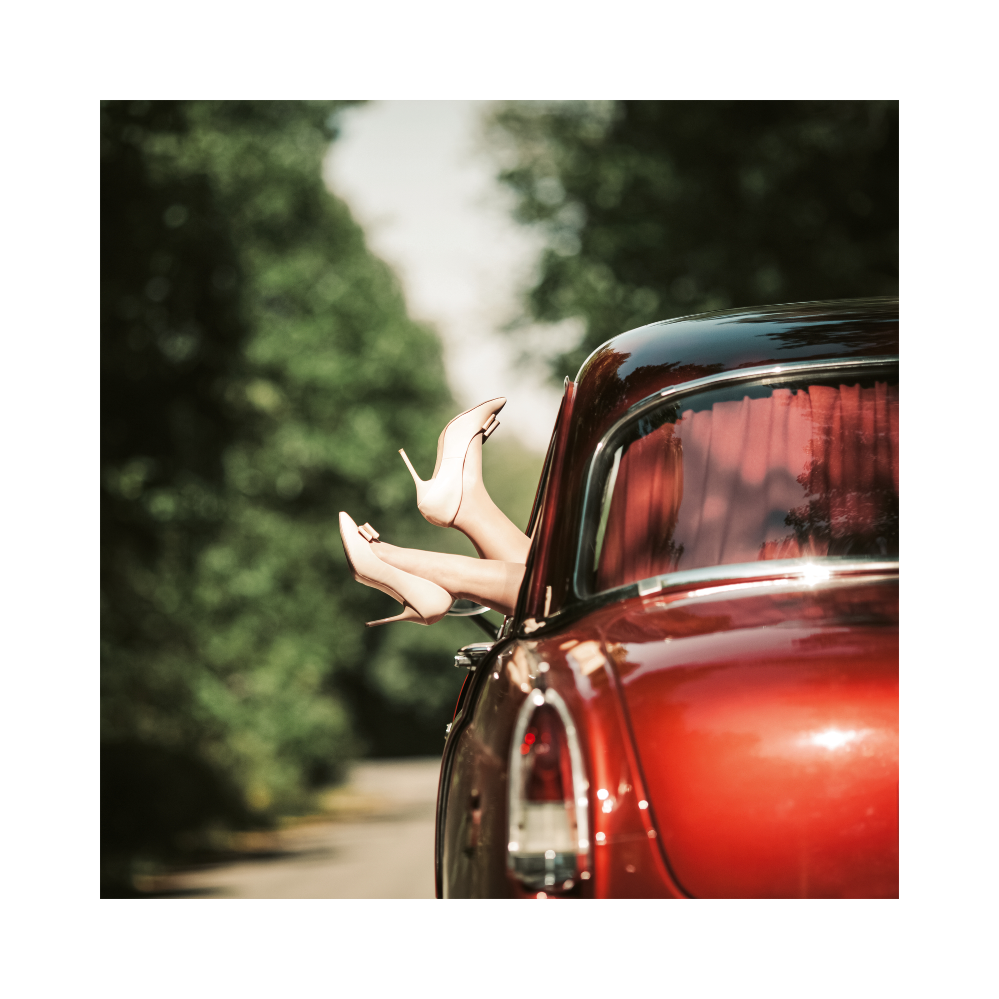 明るい太陽の下、光沢のある赤いレトロカーが駐車しています。後部窓からはベージュのハイヒールを履いた足が覗いています。車内には赤いカーテンが見え、背景には緑の木々と青空が広がります。ヴィンテージカーの魅力が詰まった、楽しい夏のロードトリップを思わせるポスターです。