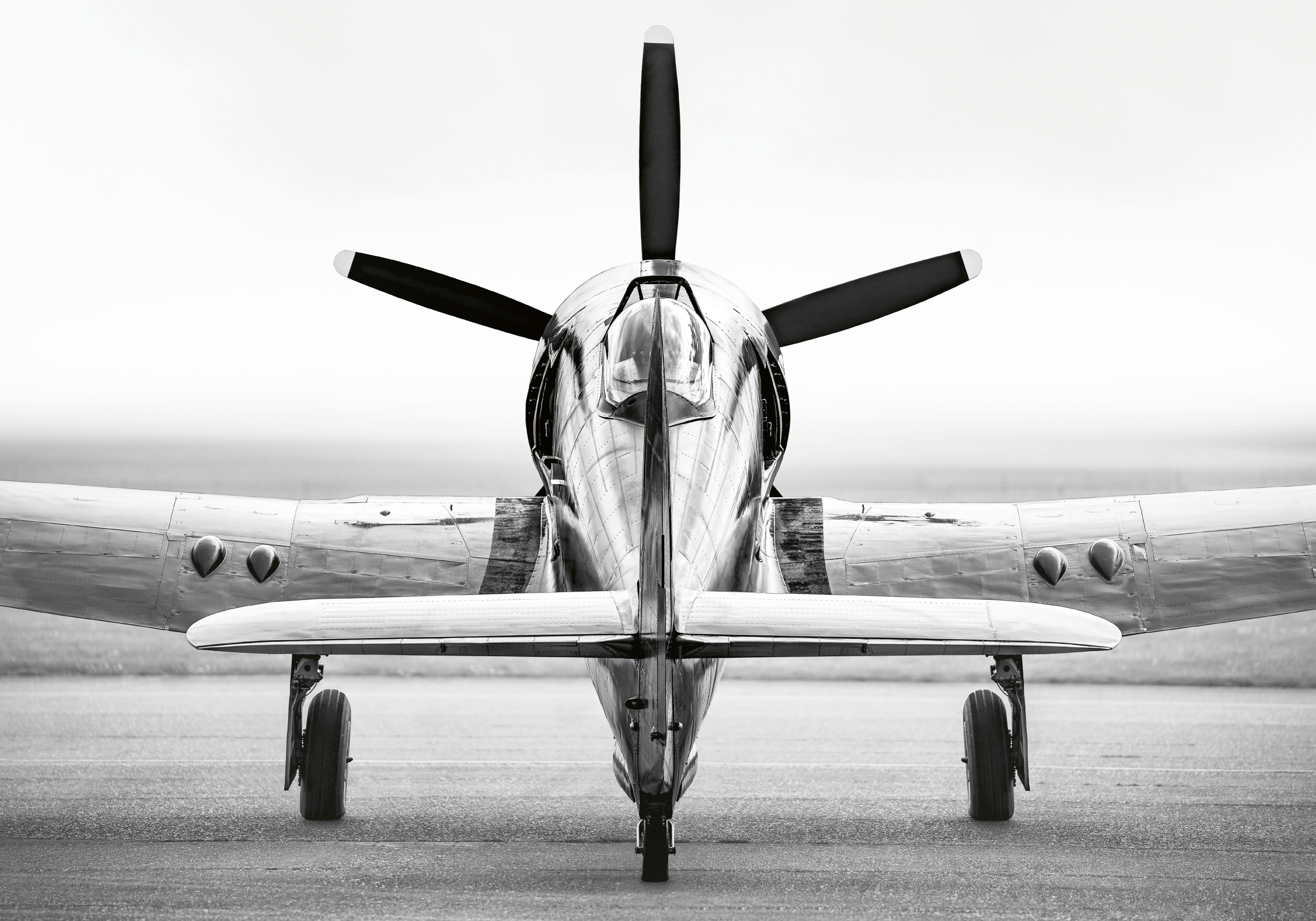 レトロな飛行機が滑走路に立つ姿を正面から捉えた、モノクロのクールなポスターです。光沢のある機体と4つのプロペラが印象的で、お部屋にヴィンテージな雰囲気を演出します。
