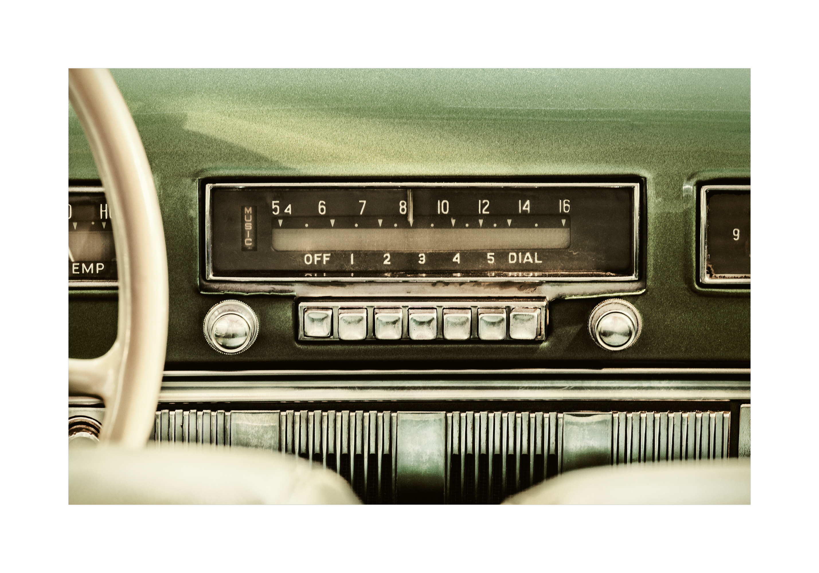 レトロなカーラジオのダッシュボードポスター。緑の背景に数字と「DIAL」の文字が表示されたラジオ、銀色のボタン、そして両側の丸いノブが特徴的です。ヴィンテージカーの雰囲気を楽しめるアート作品。