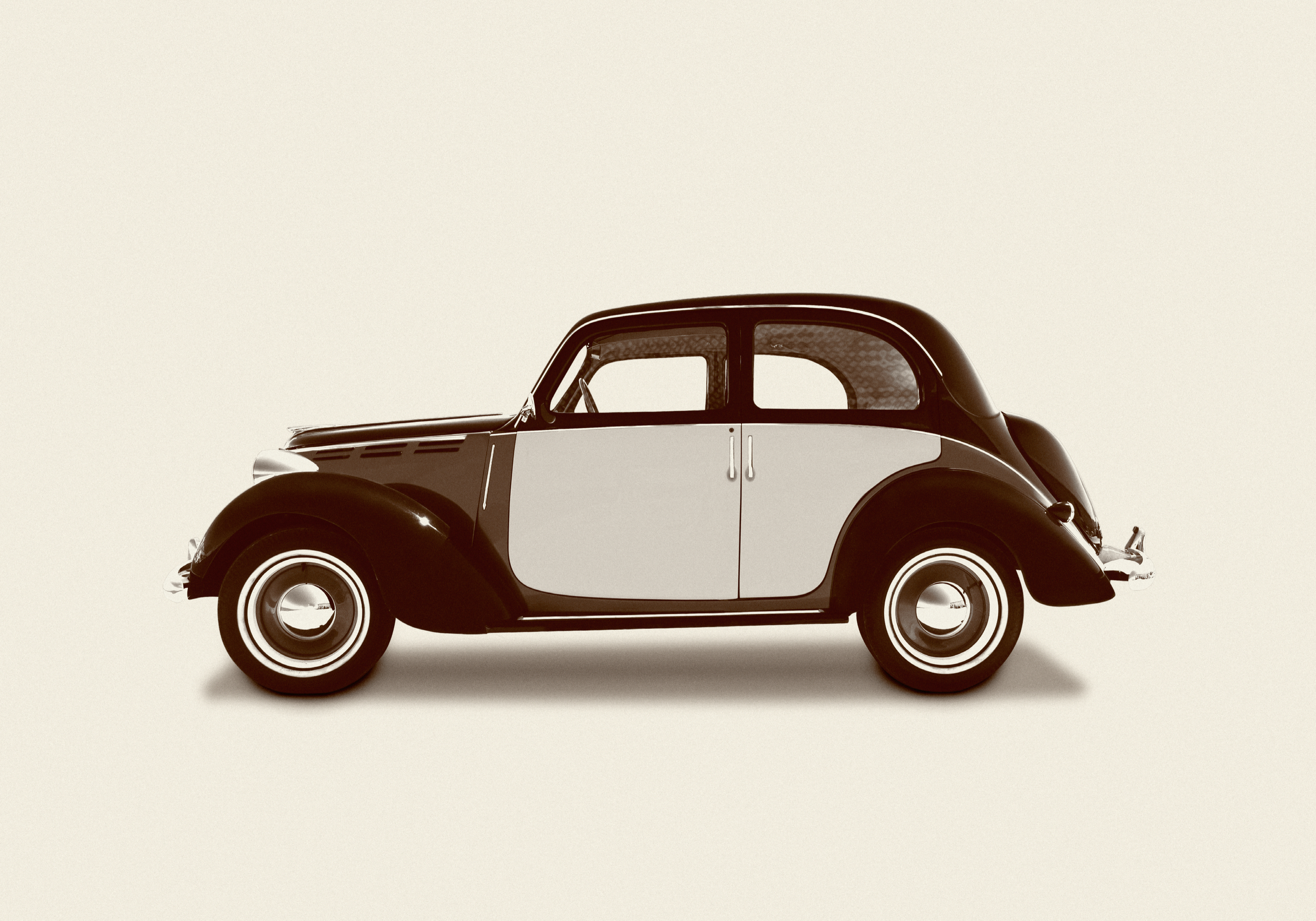 クラシックなツートンカラーのヴィンテージカーポスター。丸いヘッドライトと白いタイヤが特徴的なレトロデザイン。