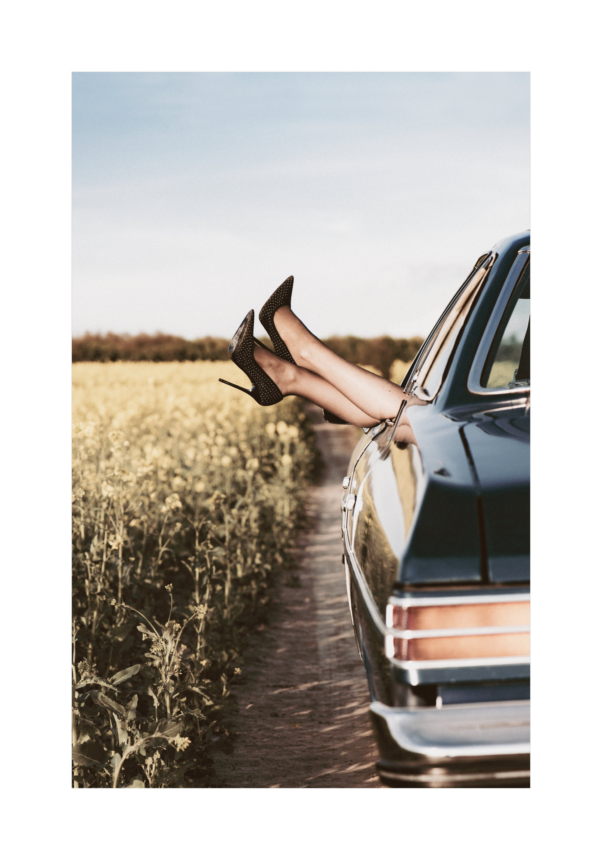 青空の下、黄色い花畑の横に停まった濃紺の車。窓から伸びる黒いハイヒールの脚が、明るく陽気な雰囲気を演出します。
