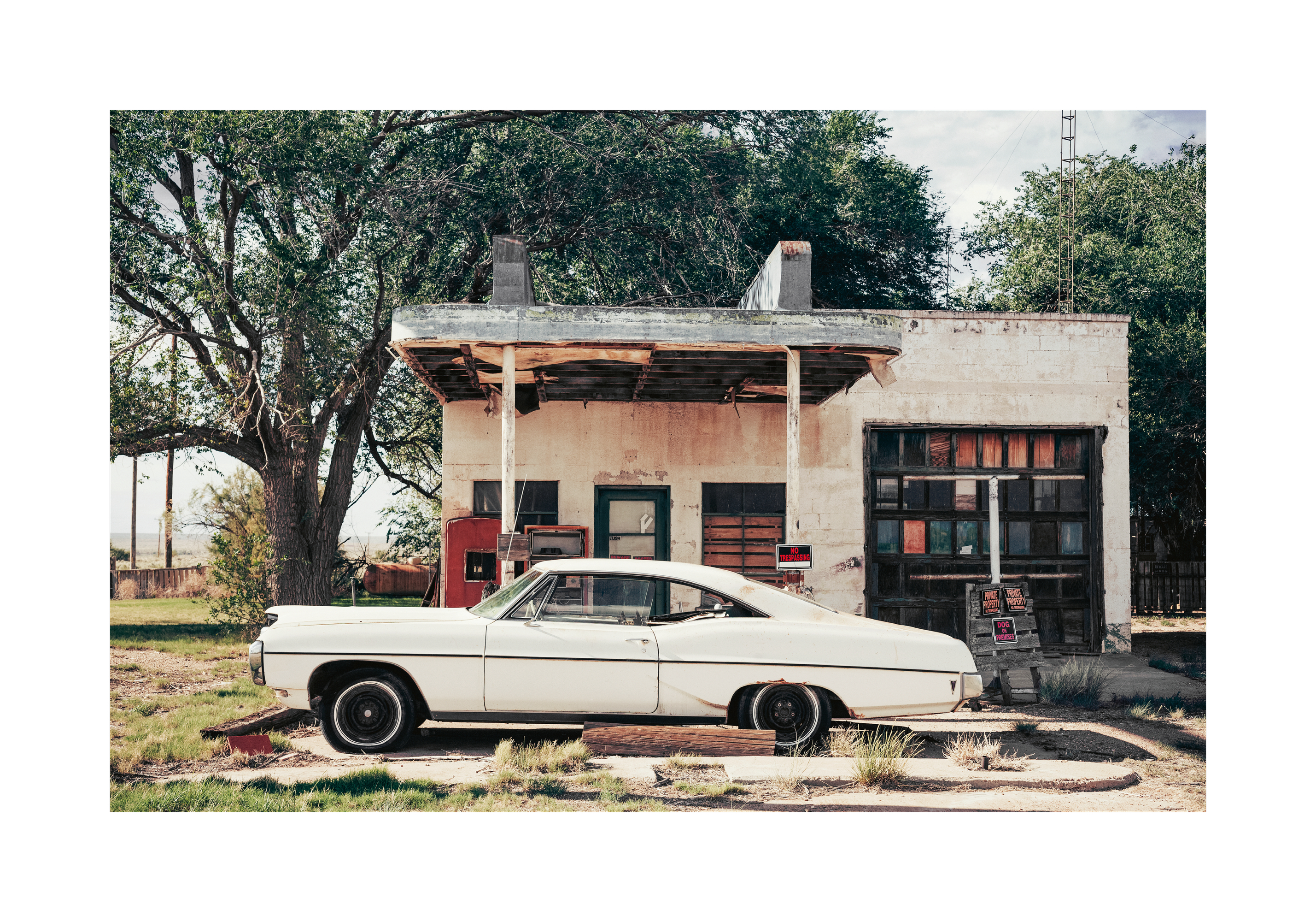 古いガソリンスタンドの前に白い車が停まっているヴィンテージポスター。木々や草が生い茂る風景が懐かしい雰囲気を演出します。
