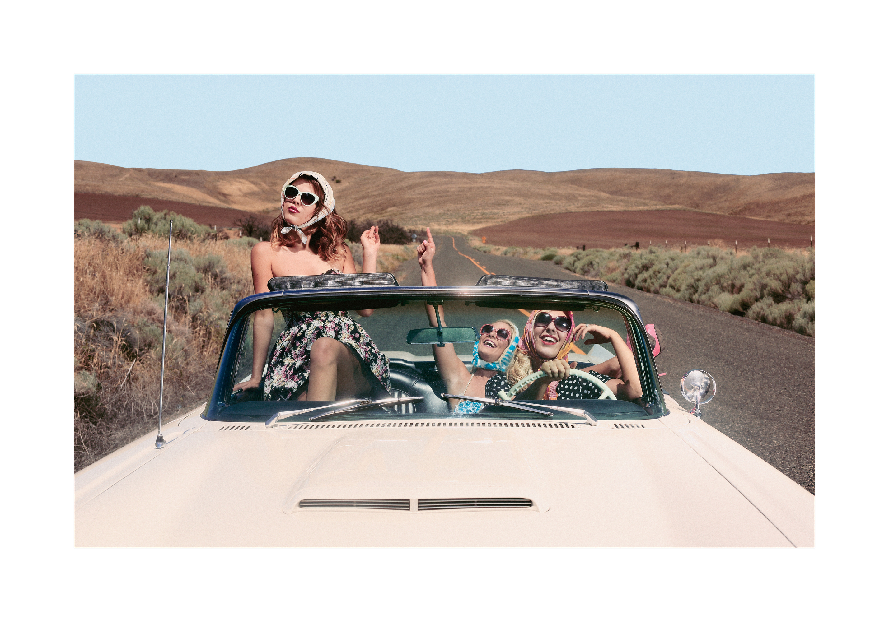 白いオープンカーで道路を走る3人の楽しい旅。カラフルなスカーフとサングラスをつけて、青空の下を自由にドライブ。茶色の丘と乾いた景色が広がる晴れた日のポスター。