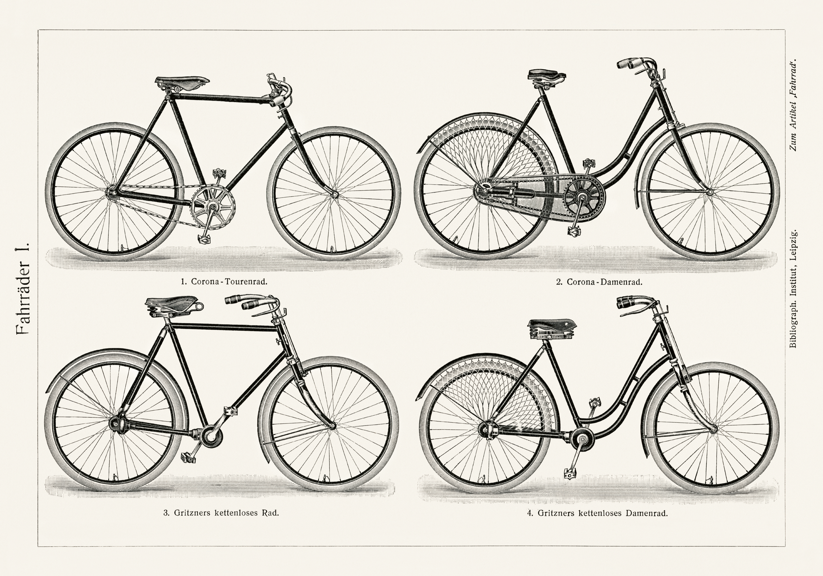 白と黒で描かれた4つのレトロな自転車のポスターです。それぞれ違うフレームのデザインが楽しめます。シンプルで懐かしい雰囲気のアートです。