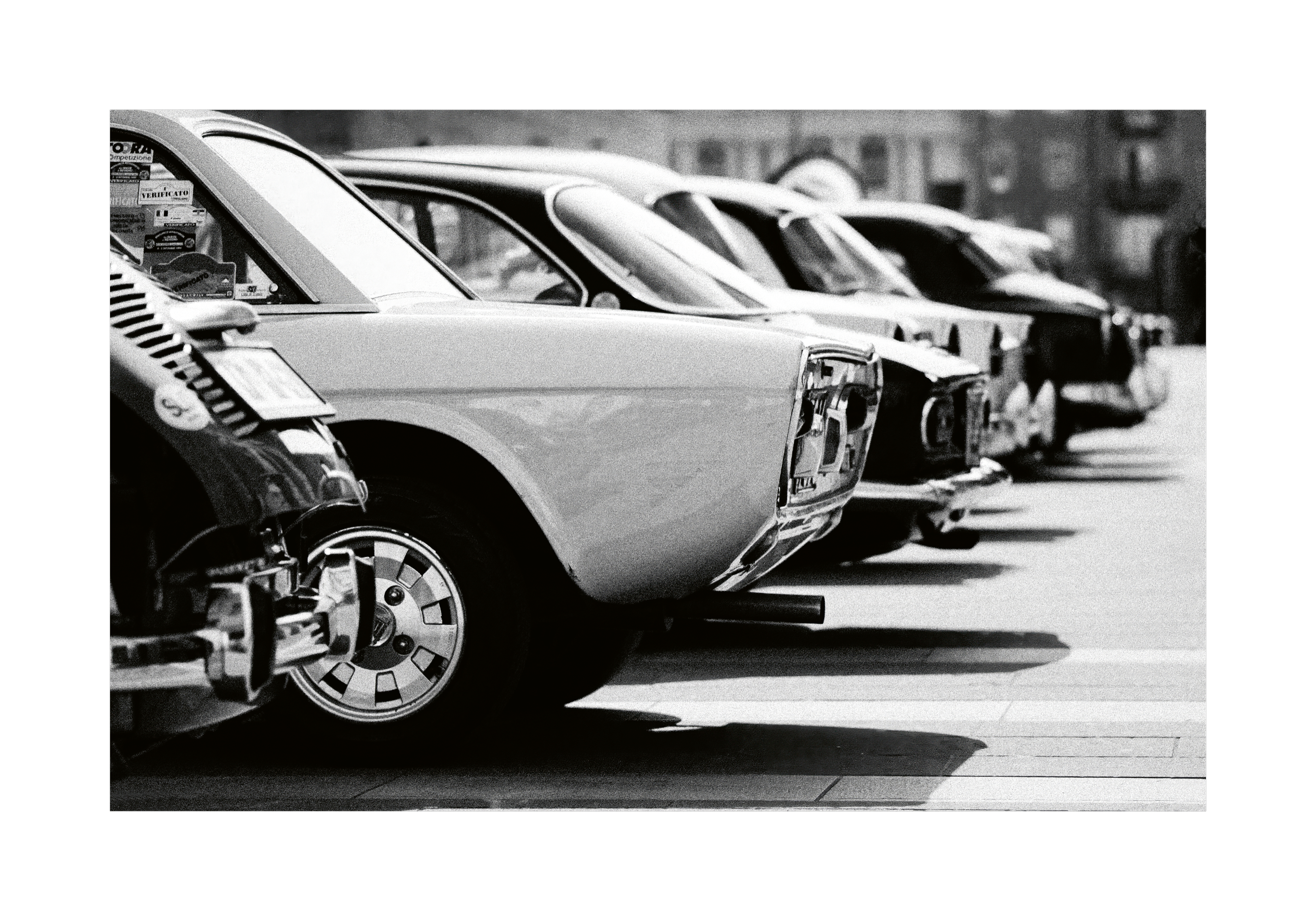 クラシックカーが並ぶ駐車場の白黒写真。丸いテールライトと光るバンパーが特徴的なレトロなデザインです。