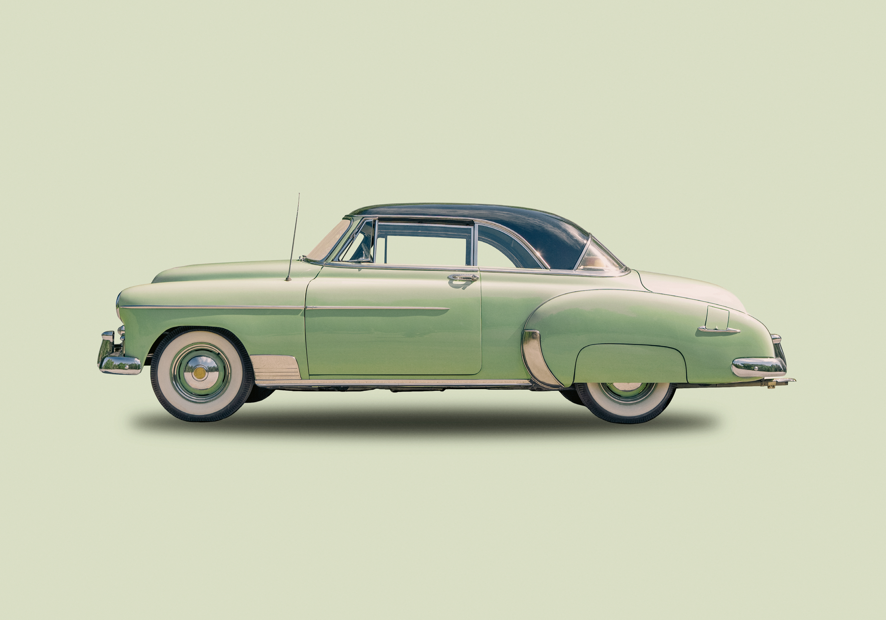 淡いグリーンの背景に映える、クラシックなライトグリーンのヴィンテージカーのポスター。丸みを帯びた優雅なフォルムとクロームの輝きが魅力的です。